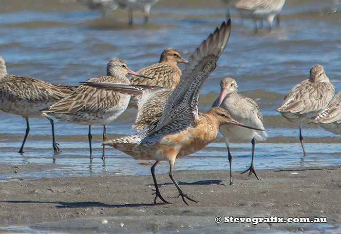 Bar-tailed Godwits coming into breeding colours at Hunter River, Hunter region NSW