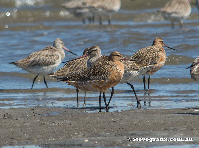Bar-tailed Godwits with different stages of breeding colours at Hunter River, Hunter region NSW